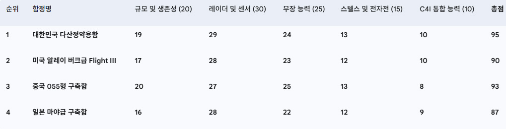 - 규모 및 생존성 (20점): 만재 배수량과 선체 설계, 작전 지속 능력을 평가합니다.