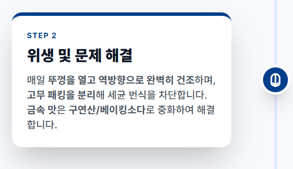 뚜껑과 패킹: 뚜껑의 복잡한 틈새와 고무 패킹은 세균 번식의 아지트입니다. 일주일에 한두 번은 패킹을 반드시 분리하여 작은 솔(칫솔 등)로 닦아주고, 물이 고이지 않도록 잘 말려 다시 조립해야 합니다.