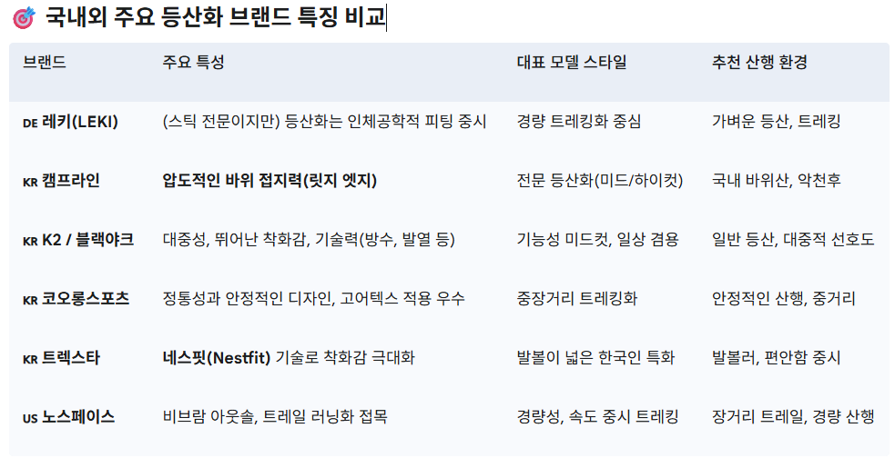 - 노스페이스(The North Face), 트렉스타(Treksta): 글로벌 기술력과 혁신. 노스페이스는 글로벌 아웃도어 트렌드를 반영한 세련된 디자인과 혁신적인 경량 기술이 특징이며, 트렉스타는 발의 움직임을 인체공학적으로 재현하는 '네스핏(Nestfit)' 기술로 전 세계적으로 인정받고 있습니다. 이 브랜드들은 해외 등반 스타일이나 장거리 트레킹에 강점을 보입니다.