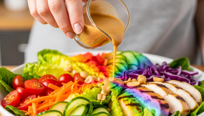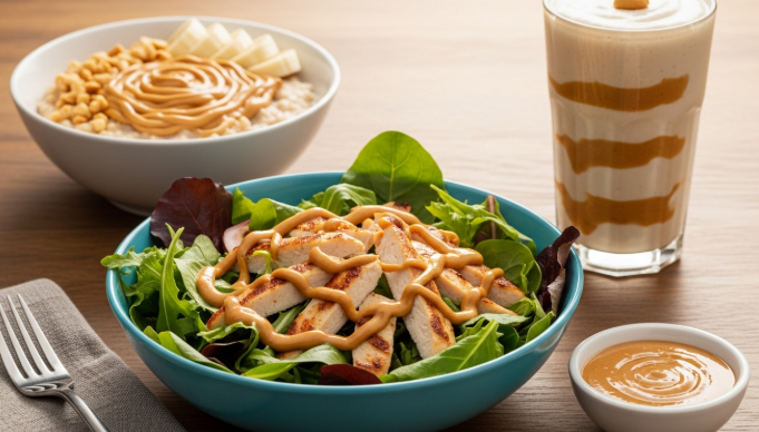- 다이어트 요리: 땅콩버터는 닭가슴살 샐러드 드레싱, 오트밀 토핑, 건강 스무디의 단백질 및 지방 보충제로 활용하기 좋습니다. 닭가슴살에 땅콩버터, 간장, 식초 등을 섞어 퓨전 샐러드 드레싱을 만들어보세요. 칼로리는 일반 드레싱보다 높을 수 있지만, 영양학적 가치가 높고 지속적인 포만감을 제공합니다.