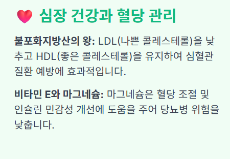 - 불포화지방산의 왕: 땅콩버터의 주요 성분인 불포화지방산은 혈중 나쁜 콜레스테롤(LDL) 수치를 낮추고 좋은 콜레스테롤(HDL) 수치를 유지하는 데 기여하여 심혈관 질환 예방에 효과적입니다. 올바른 땅콩버터를 고른다면, 이는 심장을 위한 건강한 지방 공급원입니다.