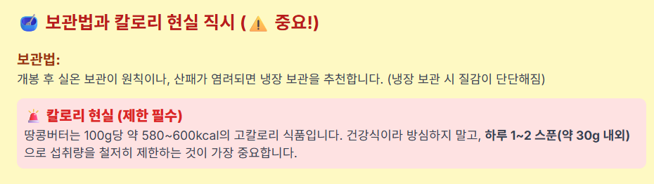 - 칼로리 현실 직시: 땅콩버터는 여전히 고칼로리 식품입니다. 일반적으로 100g당 580~600kcal에 달하며, 이는 밥 두 공기와 맞먹는 수준입니다. 따라서 건강식이나 다이어트 식품이라 하여 방심하지 말고, **하루 1~2 스푼(약 30g 내외)**으로 섭취량을 철저히 제한하는 것이 가장 중요합니다.
