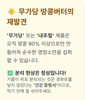 - 분리 현상, 정상입니다! 무가당 제품은 기름이 위로 분리되는 현상이 나타나는데, 이는 경화유를 넣지 않았다는 **'건강 증명서'**와 같습니다. 먹기 전에 잘 섞어주기만 하면 됩니다.