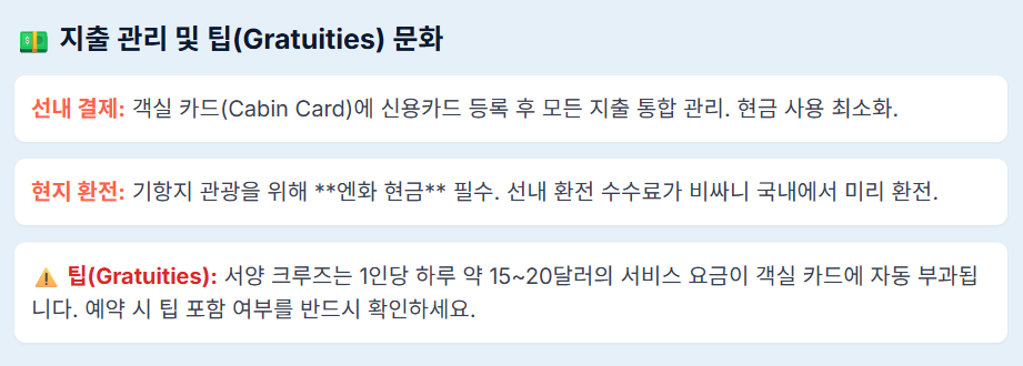 - 자동 부과되는 서비스 요금: 서양 크루즈 라인은 승객의 객실 카드에 **매일 일정 금액의 팁(Service Gratuities)**을 자동으로 부과합니다. 이는 객실 담당 승무원, 식당 종사자 등 모든 서비스 팀에게 돌아가는 인건비 개념입니다.