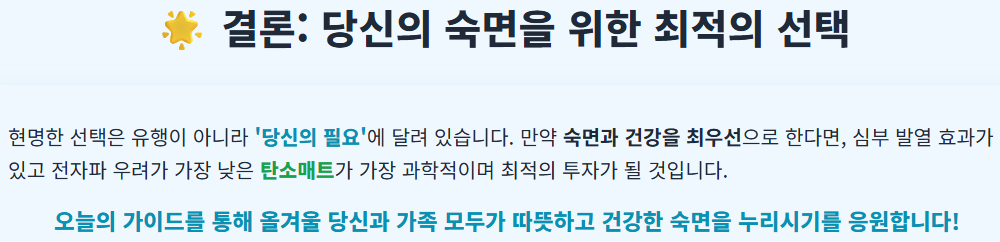 - 숙면 중시 & 건강 우선이라면: 탄소매트가 가장 과학적인 선택입니다. 온돌의 장점과 원적외선의 건강 효과를 모두 누릴 수 있습니다. (다소 비싸지만, 겨울 내내 쓸 것을 생각하면 투자할 가치가 있습니다.)
