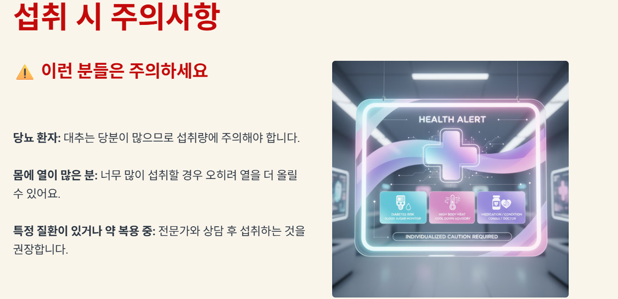 - ✅ 섭취 주의사항: 대추는 당분이 많으므로 당뇨 환자는 섭취량 조절이 필요하며, 몸에 열이 많은 분은 과다 섭취를 피하는 것이 좋습니다.