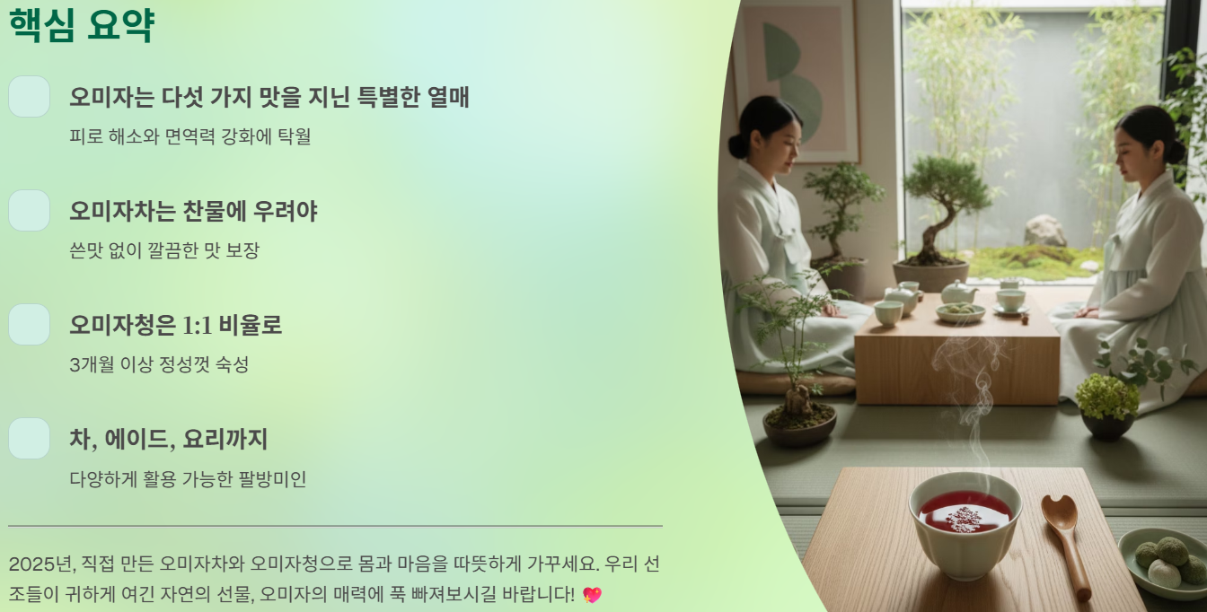 - ✅ 오미자는 차, 에이드, 요리 등 다양하게 활용할 수 있는 팔방미인입니다.