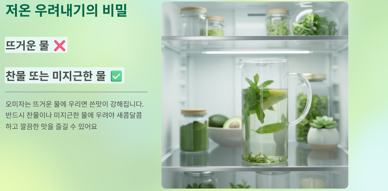 - ✅ 오미자차는 찬물에 우려야 쓴맛 없이 깔끔한 맛을 즐길 수 있습니다.