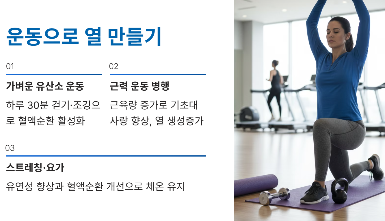 - 가벼운 유산소 운동: 하루 30분 정도의 걷기, 조깅, 실내 자전거 타기 등은 혈액순환을 활발하게 하고 체온을 자연스럽게 올려줍니다.
