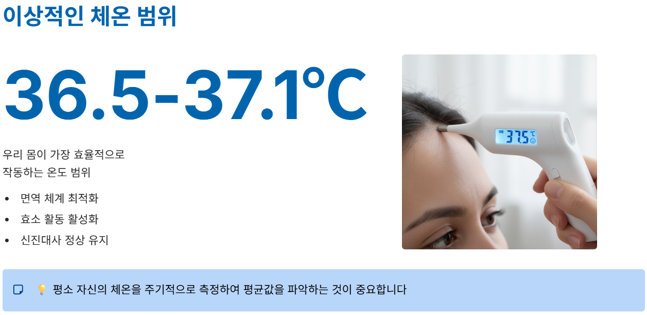 - ✅ 체온 1도 상승은 노화 방지, 면역력 강화에 중요한 역할을 합니다.