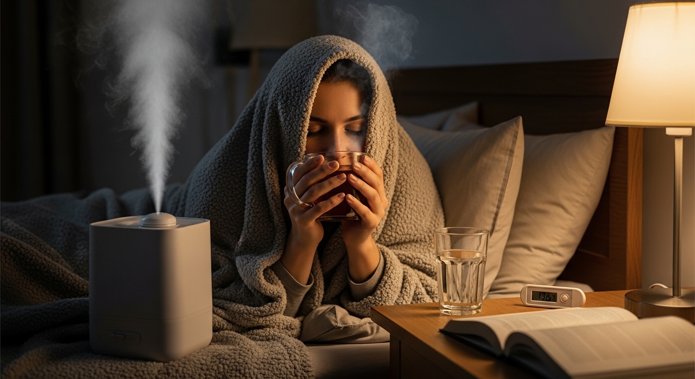 - ✔️ 가습, 증기 흡입, 소금물 가글은 코막힘과 인후통 완화에 도움을 줍니다.