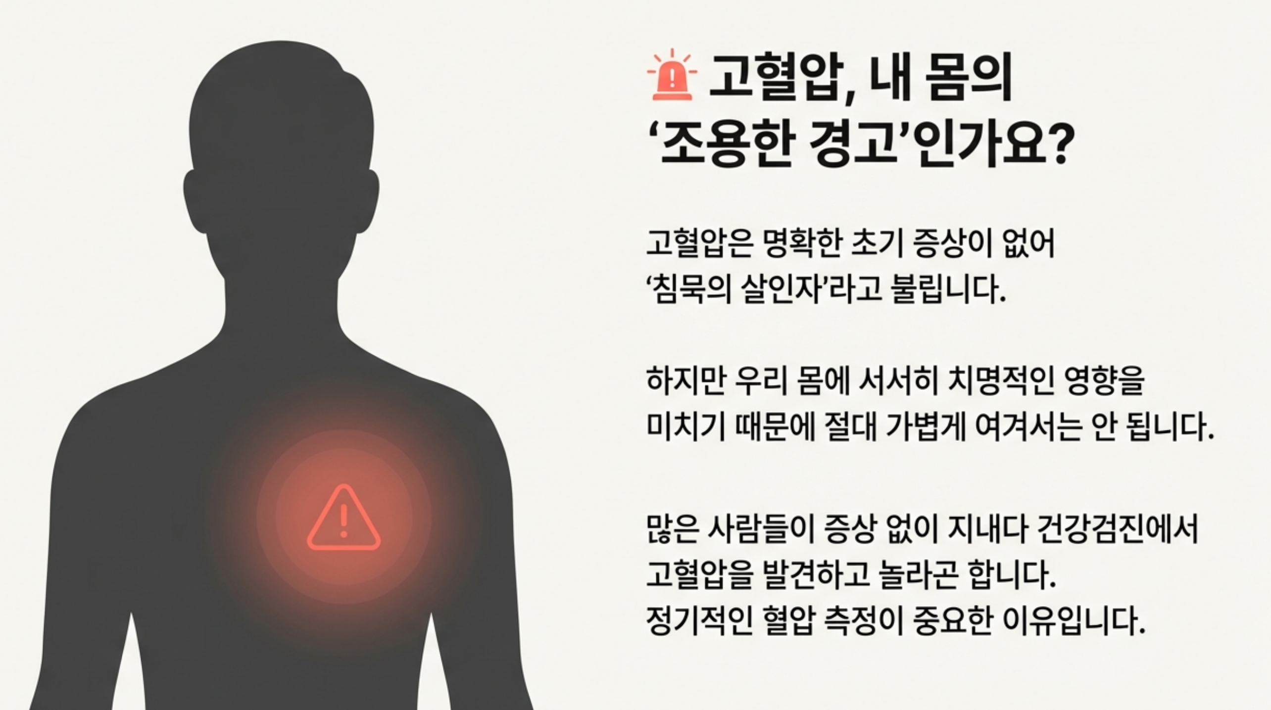 - 1. 고혈압은 초기 증상이 없어 '침묵의 살인자'로 불리며, 정기적인 혈압 측정이 중요해요.