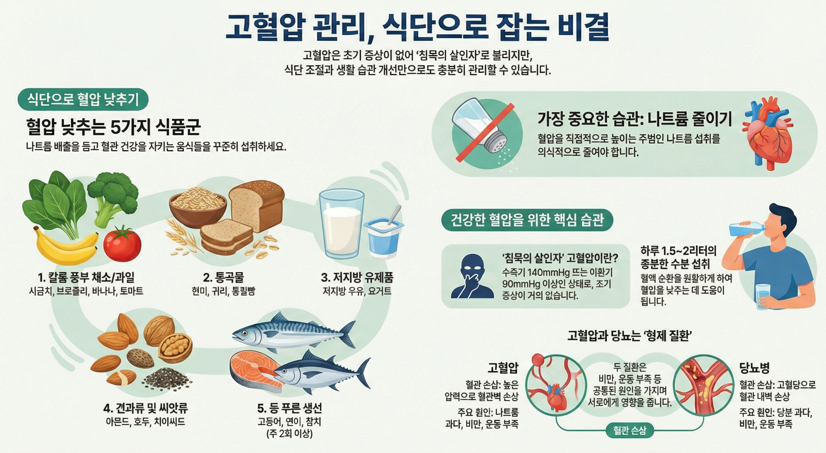 - 4. 고혈압과 당뇨는 상호 영향을 미치는 형제 질환이므로, 생활 습관 개선을 통해 두 질환을 함께 관리해야 해요.