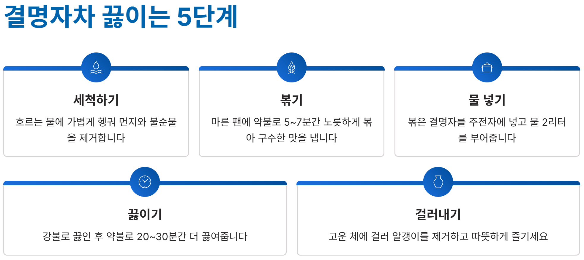 - 끓이는 시간: 강불에서 물이 끓기 시작하면 약불로 줄이고 20~30분 정도 더 끓여주세요. 색이 진하게 우러나오고 구수한 향이 나면 완성입니다.