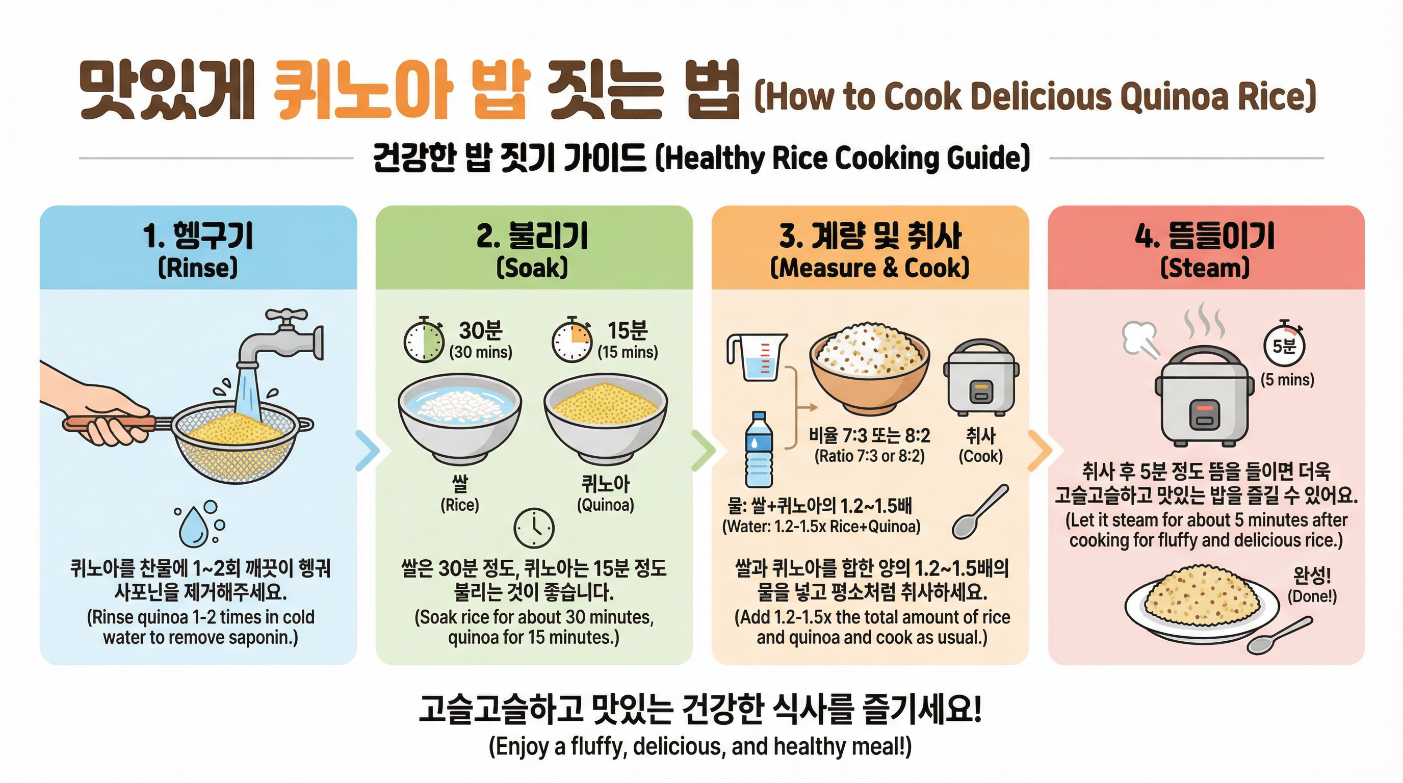 퀴노아 밥을 지으려면 먼저 퀴노아를 찬물에 1~2회 깨끗이 헹궈 사포닌을 제거해주세요. 쌀과 퀴노아를 섞을 경우, 쌀은 30분 정도, 퀴노아는 15분 정도 불리는 것이 좋습니다. 쌀과 퀴노아의 비율은 보통 7:3 또는 8:2가 적당하며, 물은 쌀과 퀴노아를 합한 양의 1.2~1.5배 정도를 넣어 밥솥으로 평소 밥 짓듯이 취사하면 됩니다. 취사 후 5분 정도 뜸을 들이면 더욱 고슬고슬하고 맛있는 밥을 즐길 수 있어요. (본문 밥짓기 참조)