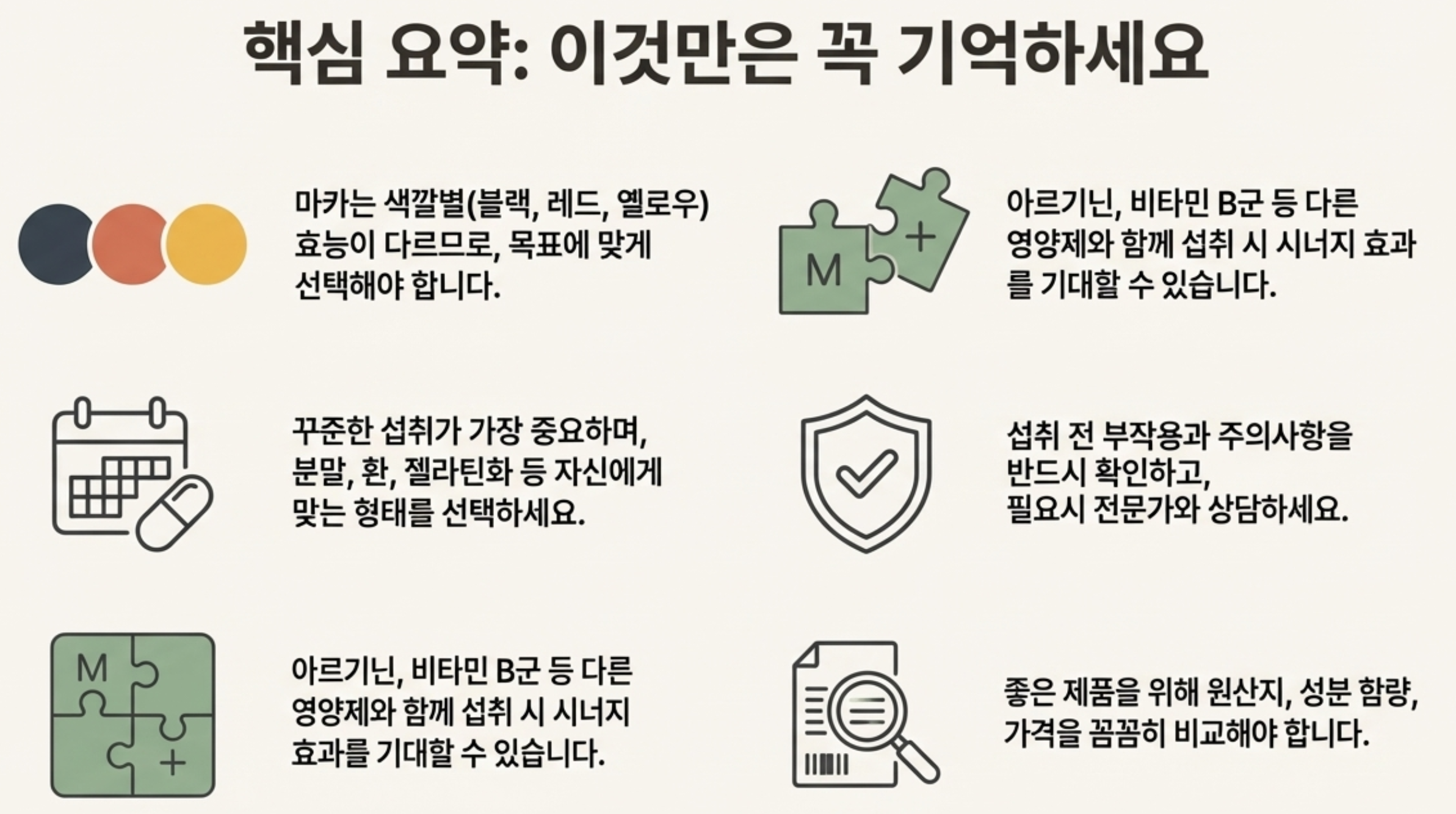 - 3. 마카는 아르기닌, 비타민 B군 등과 함께 섭취 시 시너지 효과를 기대할 수 있습니다.
