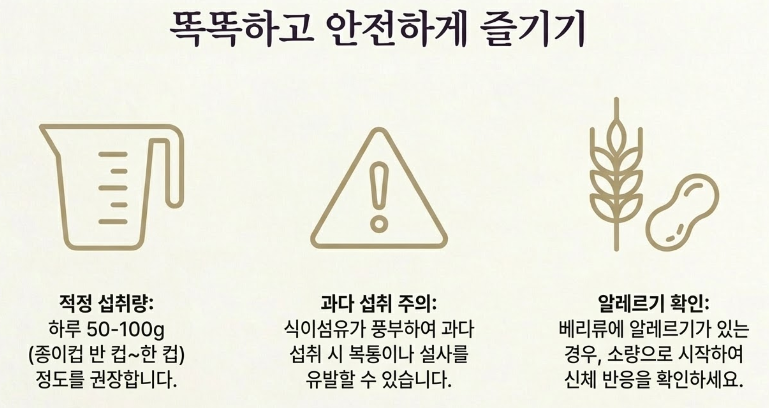 - 적정 섭취량과 주의사항: 하루 50~100g 정도의 적정량을 지키고, 특정 질환이나 약물 복용 시에는 전문가와 상담 후 섭취하는 것이 좋습니다.