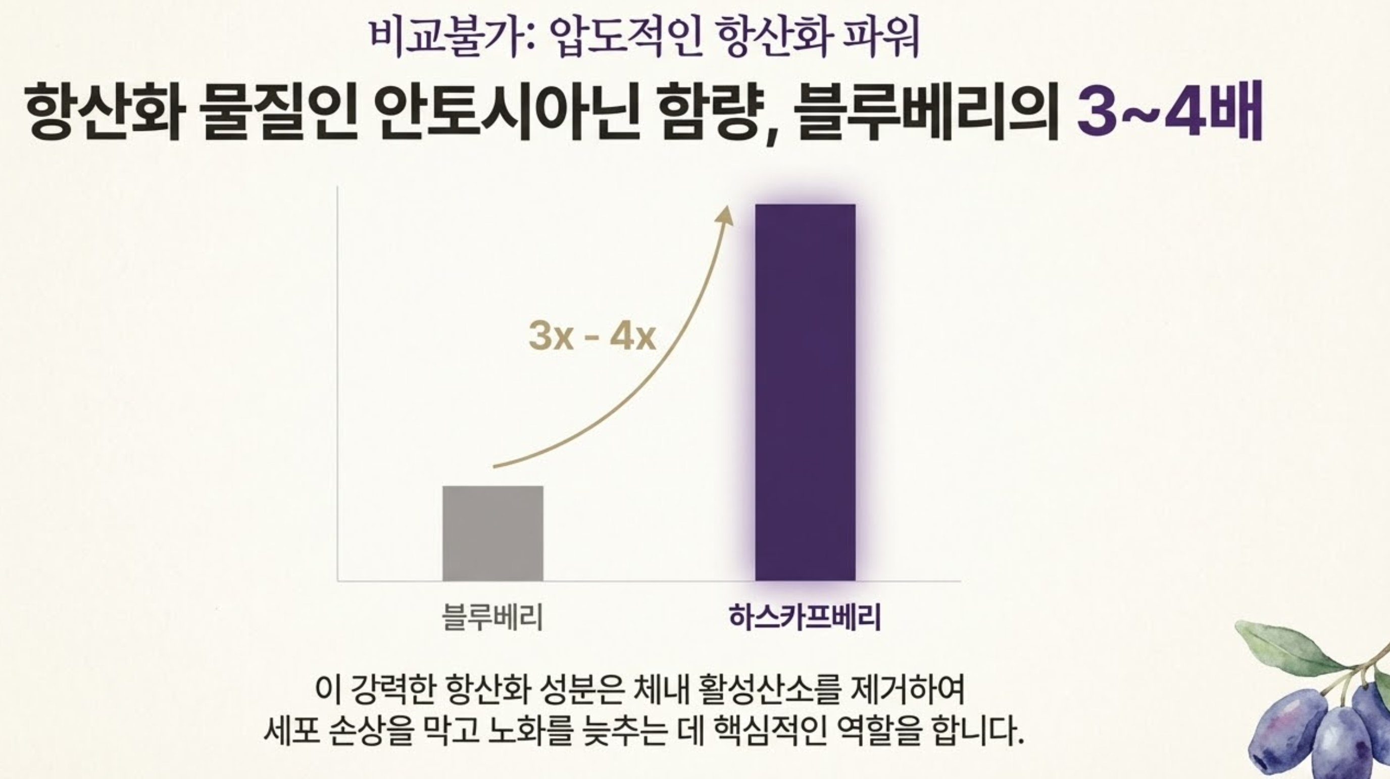 - 블루베리를 뛰어넘는 항산화 파워: 하스카프베리는 안토시아닌이 블루베리보다 훨씬 풍부하여 강력한 항산화 및 항염증 효과를 제공합니다.