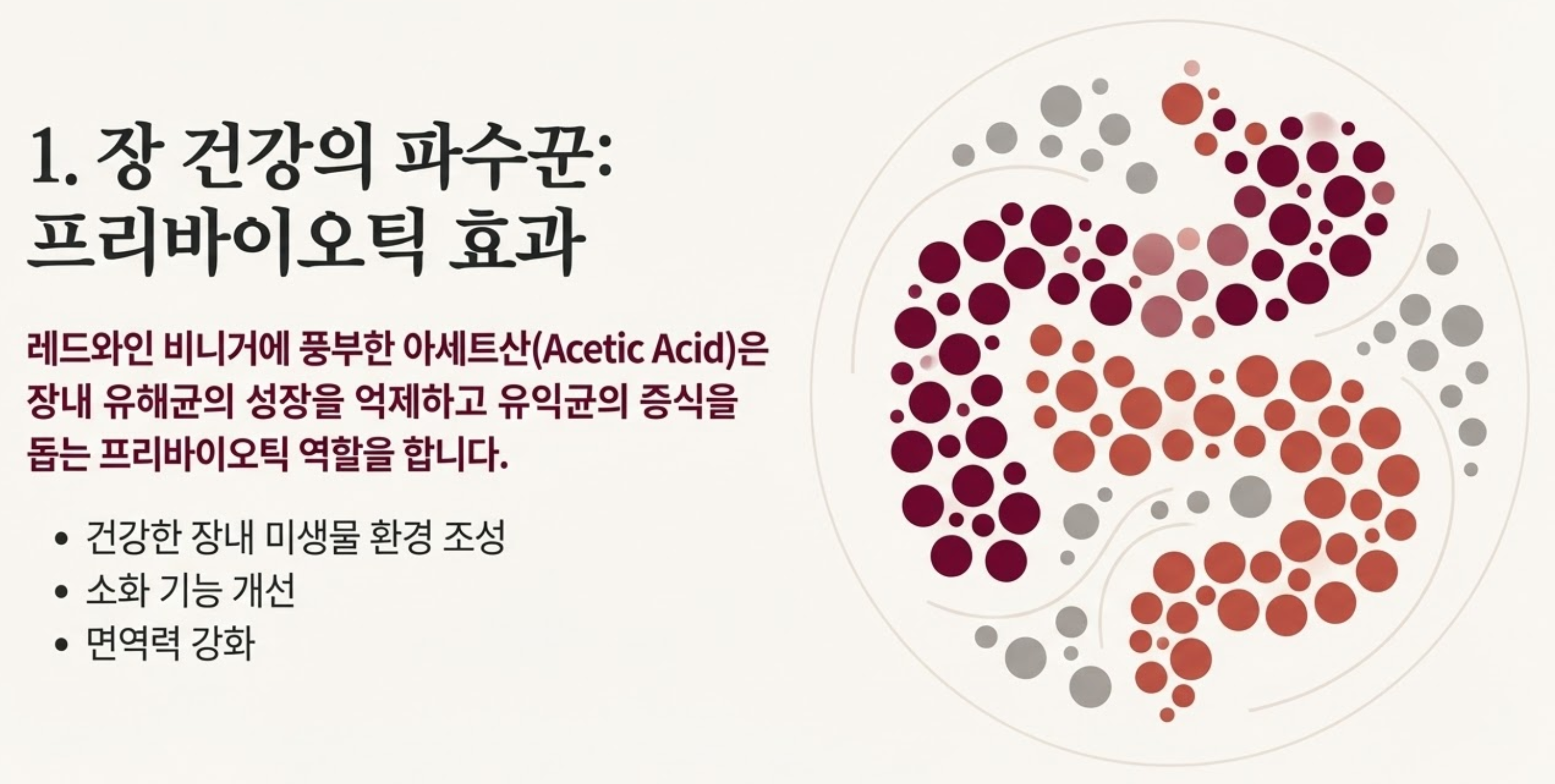 레드와인 비니거의 가장 주목할 만한 효능 중 하나는 바로 장 건강 개선입니다. 비니거에 풍부한 아세트산(Acetic Acid)은 장내 유해균의 성장을 억제하고 유익균의 증식을 돕는 프리바이오틱 역할을 합니다. 이는 건강한 장내 미생물 환경을 조성하여 소화 기능 개선은 물론, 면역력 강화에도 긍정적인 영향을 미칠 수 있습니다. 저도 평소 장이 예민한 편이라 꾸준히 섭취하고 있는데, 확실히 속이 편안해지는 것을 느끼고 있어요.