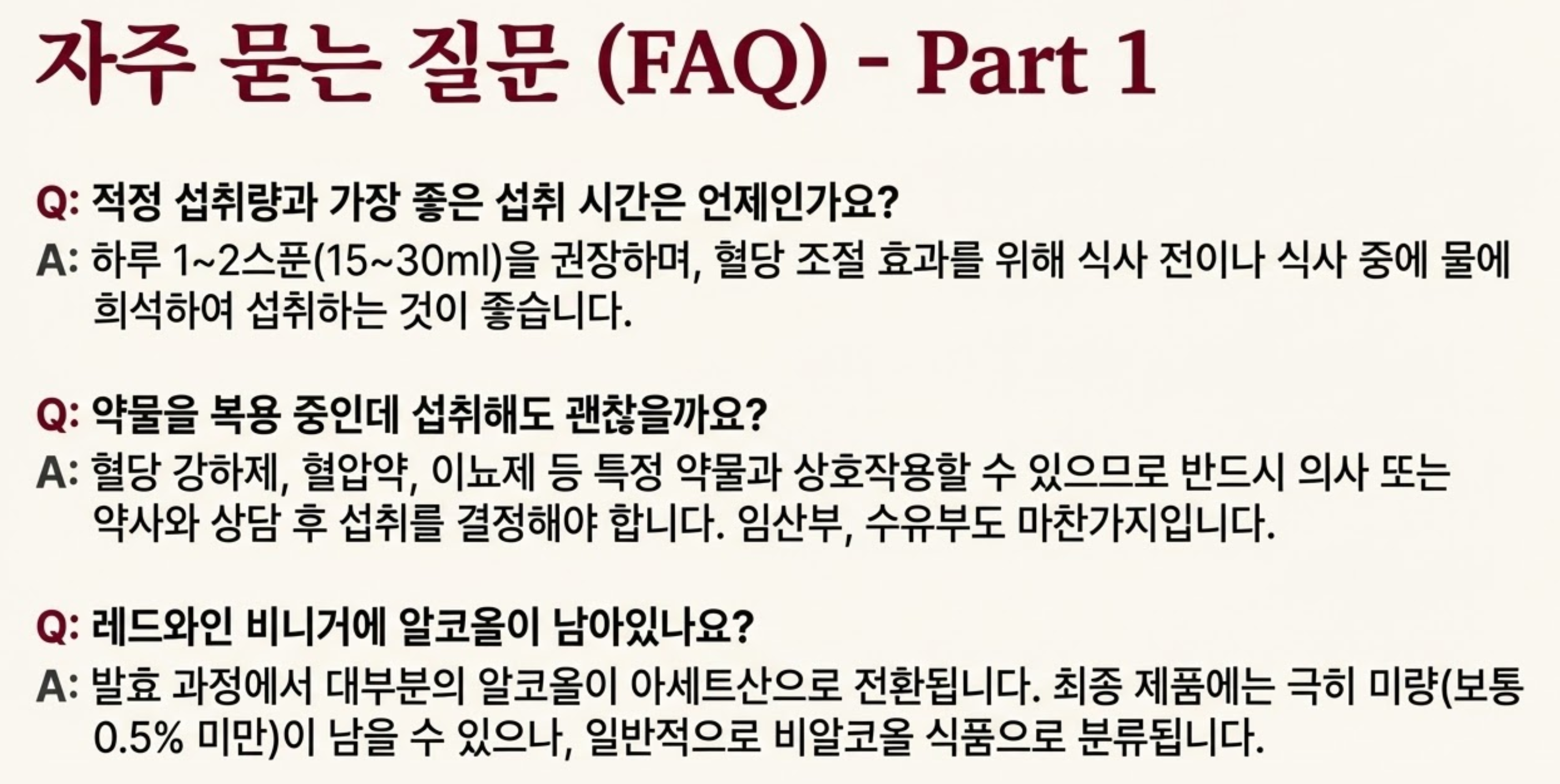 A: 특정 약물(예: 혈당 강하제, 혈압약, 이뇨제 등)을 복용 중인 경우 레드와인 비니거가 약물의 효과에 영향을 줄 수 있으므로, 반드시 의사 또는 약사와 상담 후 섭취를 결정해야 합니다. 임산부, 수유부도 마찬가지입니다.