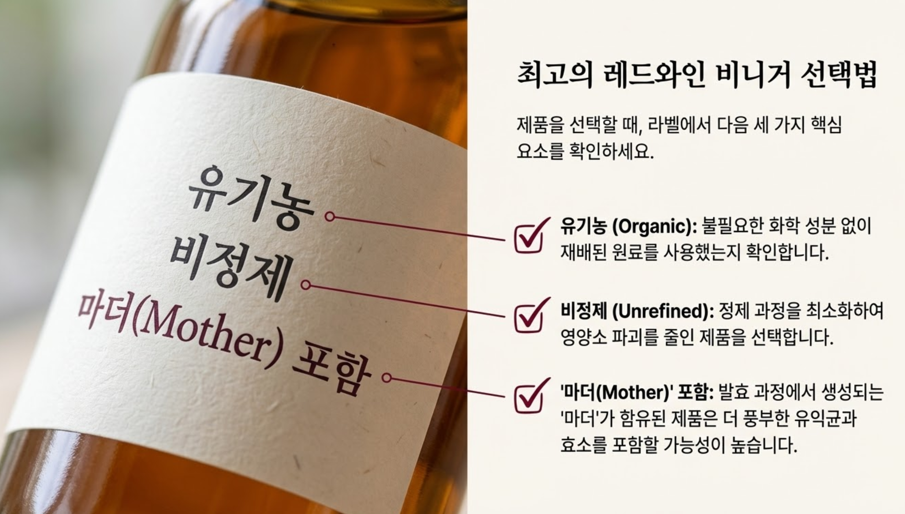 A: 첨가물이 적고, 유기농 인증을 받은 비정제 레드와인 비니거를 선택하는 것이 좋습니다. '마더(Mother)'라고 불리는 발효 부산물이 포함된 제품은 더욱 풍부한 유익균을 함유하고 있을 가능성이 높습니다.