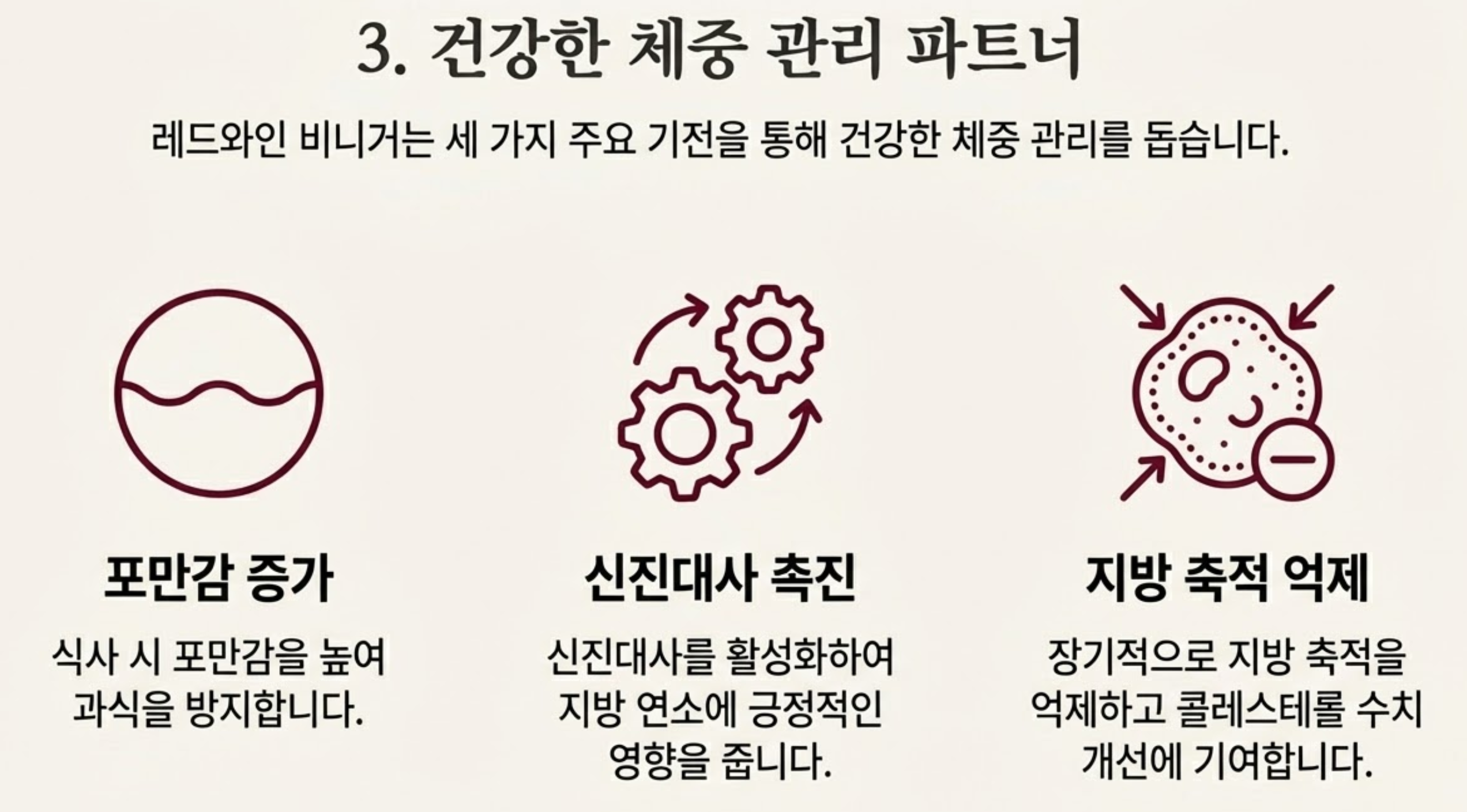 건강한 다이어트는 많은 사람들의 영원한 관심사죠. 레드와인 비니거는 몇 가지 기전을 통해 체중 관리에 도움을 줄 수 있습니다. 우선, 포만감을 증가시켜 과식을 줄이는 데 기여하고, 신진대사를 촉진하여 지방 연소에도 긍정적인 영향을 미칠 수 있습니다. 또한, 지방 축적을 억제하고 콜레스테롤 수치를 개선하는 데도 도움이 된다는 연구 결과도 있어, 장기적인 관점에서 건강한 체중을 유지하는 데 좋은 파트너가 될 수 있습니다.