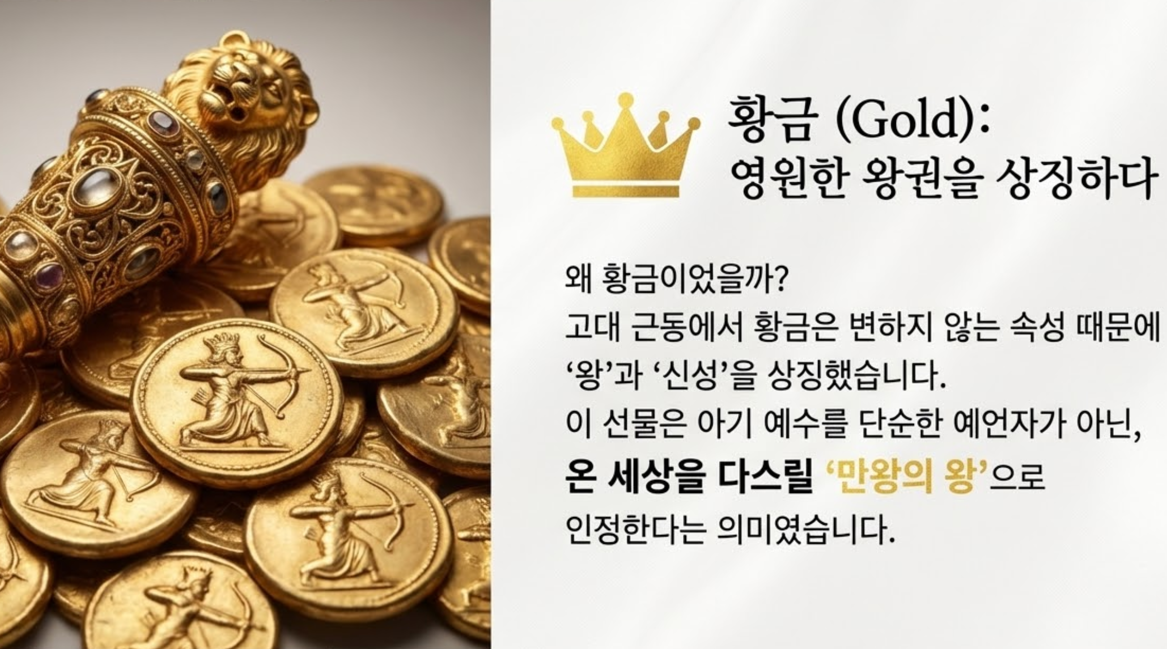 단순히 비싼 걸 고른 게 아닙니다. 이 세 가지 품목에는 아기 예수의 정체성을 꿰뚫어 보는 놀라운 신학적 통찰이 담겨 있습니다.
