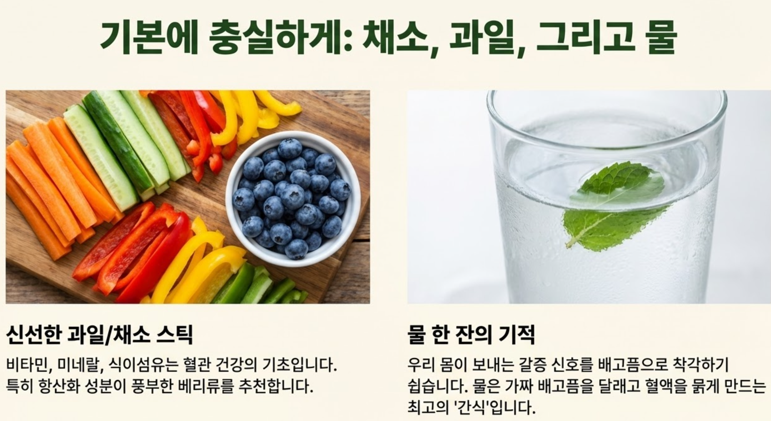 - 물 한 잔의 기적: 가짜 배고픔을 달래고 혈액을 묽게 만드는 최고의 간식은 사실 물입니다. 하루 8잔 이상 꾸준히 마셔보세요.