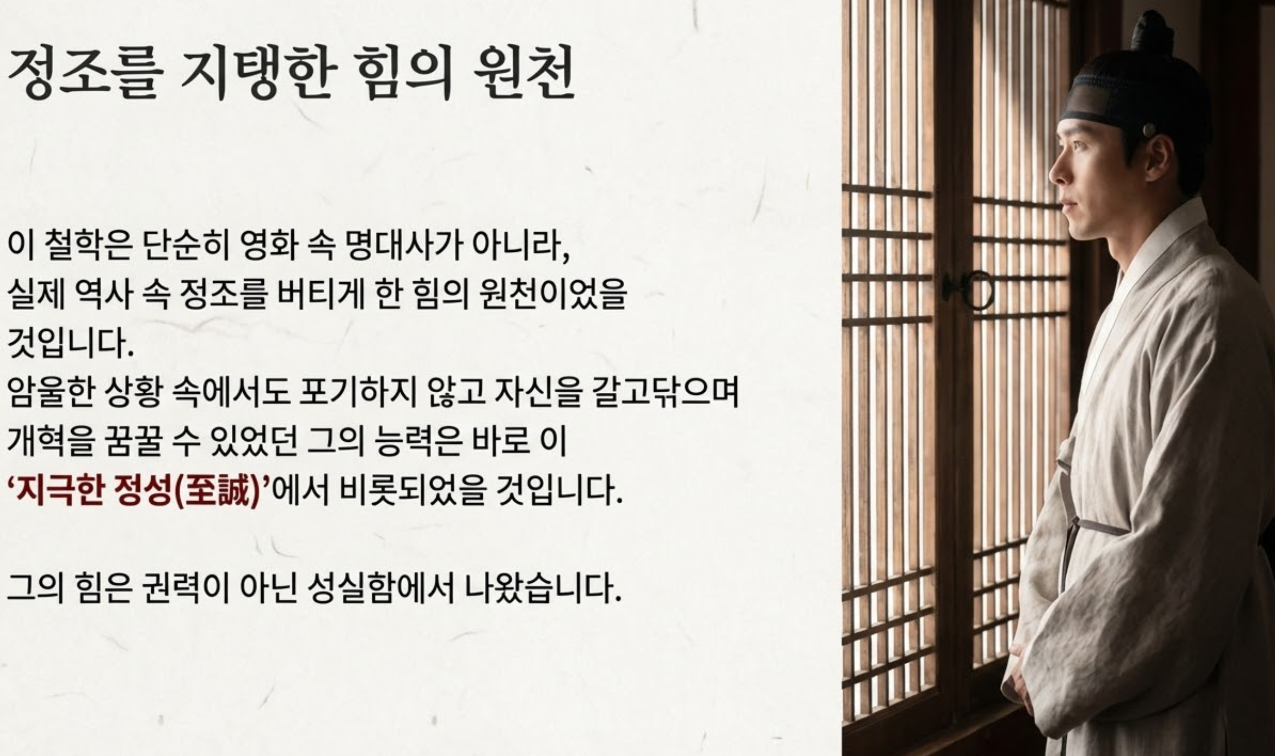 정조가 그토록 암울했던 상황 속에서도 포기하지 않고 자신을 갈고닦으며 개혁을 꿈꿀 수 있었던 힘의 원천이 바로 이 '지극한 정성(至誠)'이 아니었을까요? 그의 독서와 활쏘기, 그리고 신하들과의 치열한 논쟁 속에서 보여준 끈기 있는 모습들은 모두 이 '지극한 정성'의 발현이라고 볼 수 있습니다. 이 메시지는 수백 년의 시간을 뛰어넘어 2025년 오늘을 살아가는 우리에게도 여전히 유효한 삶의 지혜이자, 세상을 변화시키는 강력한 동기가 됩니다.