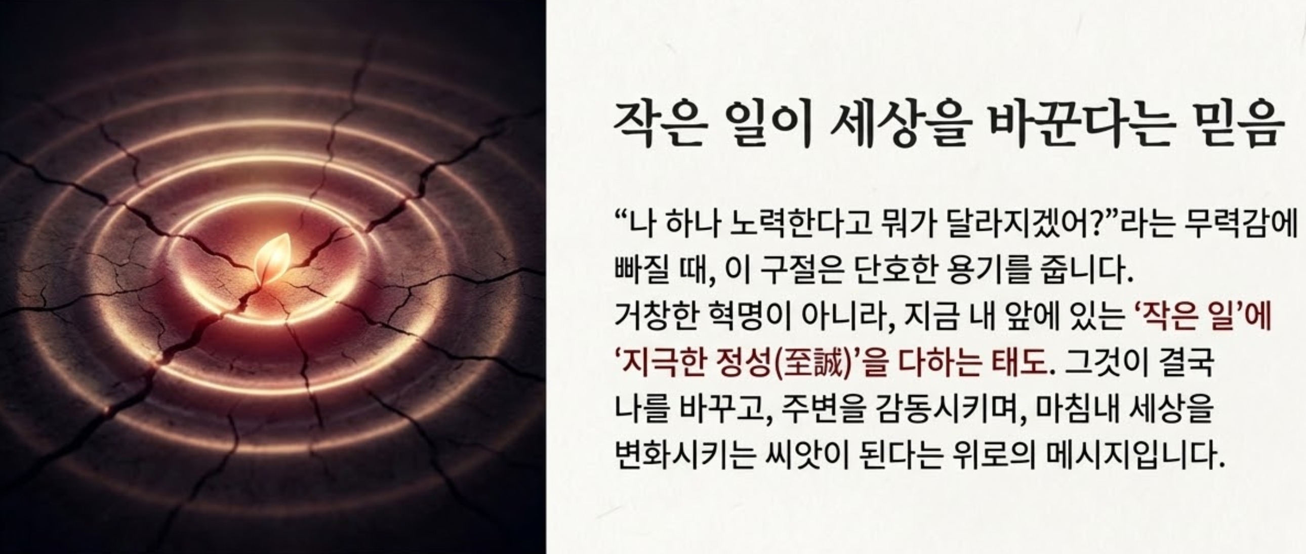 우리는 종종 "세상은 절대 변하지 않아", "나 하나 노력한다고 뭐가 달라지겠어?"라는 무력감에 빠지곤 합니다. 특히 나이가 들수록 거대한 현실의 벽 앞에서 좌절한 경험이 많기에 더욱 그렇죠. 하지만 이 '중용'의 구절은 우리에게 따뜻하면서도 단호한 위로와 용기를 건넵니다. 거창한 혁명이나 한 번의 거대한 변화가 아니라, 지금 내 앞에 있는 '작은 일'에 지극한 정성(至誠)을 다하는 태도. 즉, 꾸준하고 성실하게 자신의 본분을 다하고 책임을 다하는 노력이 결국 나를 성숙시키고, 주변 사람들에게 긍정적인 영향을 주며, 마침내 더 나은 세상을 만드는 씨앗이 된다는 것입니다.