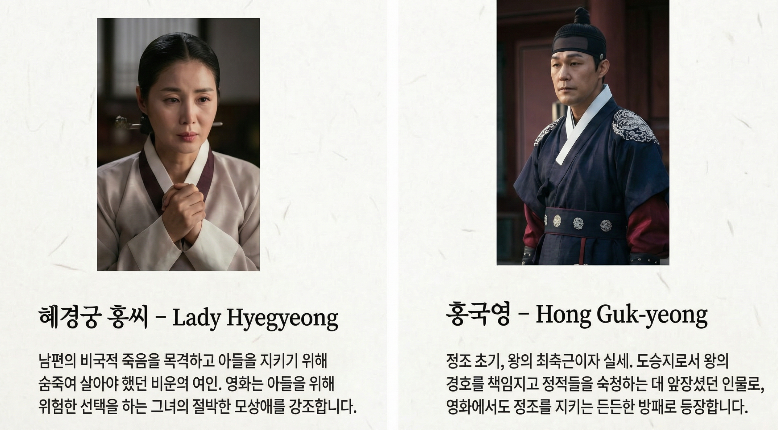 - 혜경궁 홍씨 (김성령 분): 사도세자의 부인이자 정조의 친어머니입니다. 남편의 죽음을 목격하고 아들을 지키기 위해 숨죽여 살아야 했던 비운의 여인입니다. 영화에서는 아들을 위해 위험한 선택을 하는 강인한 모성애를 보여줍니다.