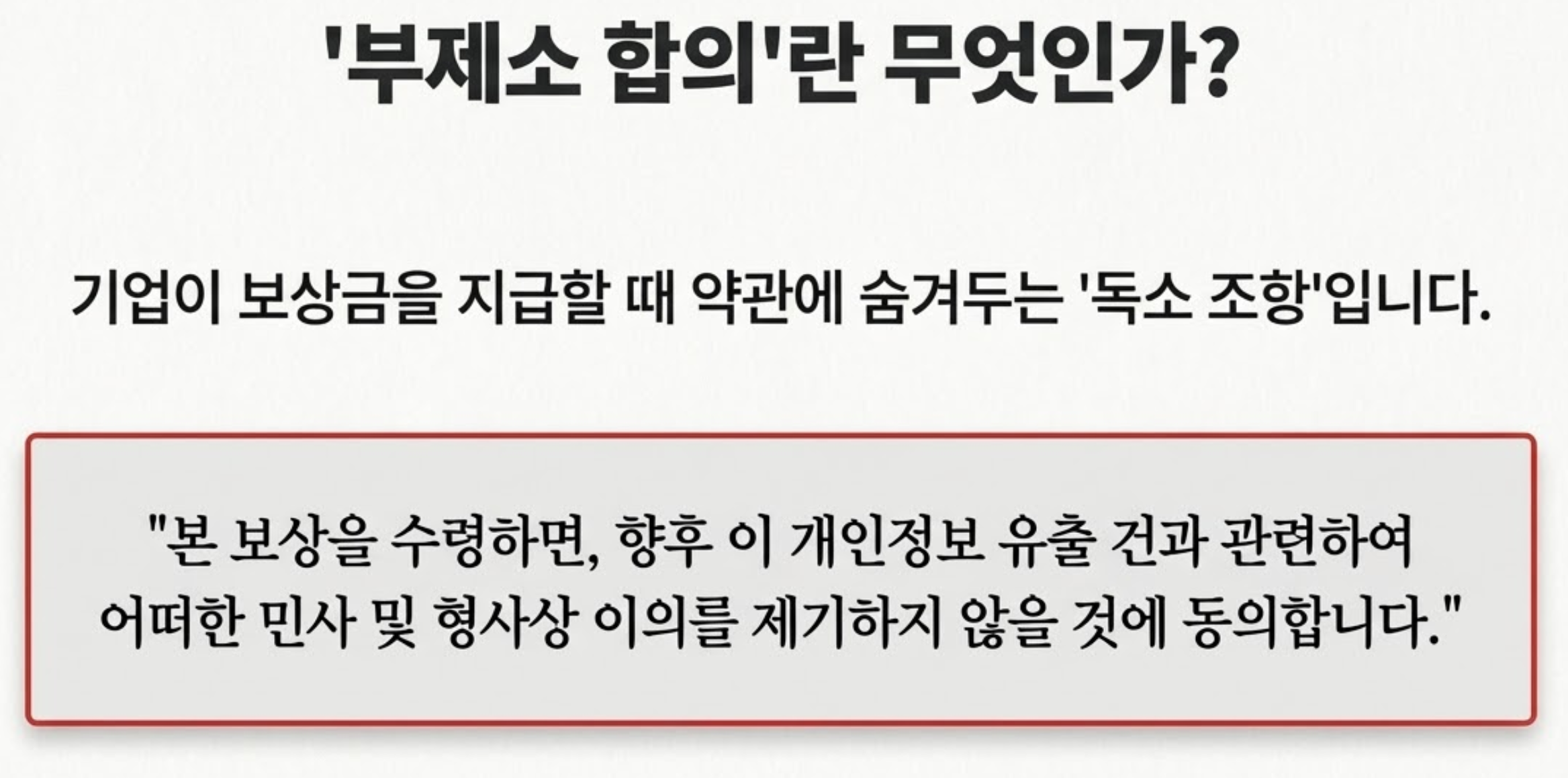 더 심각한 문제는 '부제소 합의(不提訴 合意)' 조항입니다. 기업이 보상금 지급 시 약관에 "이 보상을 수령하면 향후 민/형사상 이의를 제기하지 않는다"는 문구를 포함하는 경우가 있어요. 이 조항에 동의하면, 나중에 피해 규모가 커져 더 큰 배상을 받을 기회가 사라질 수 있습니다. 푼돈과 내 법적 권리를 맞바꾸는 일은 절대 없어야 합니다.