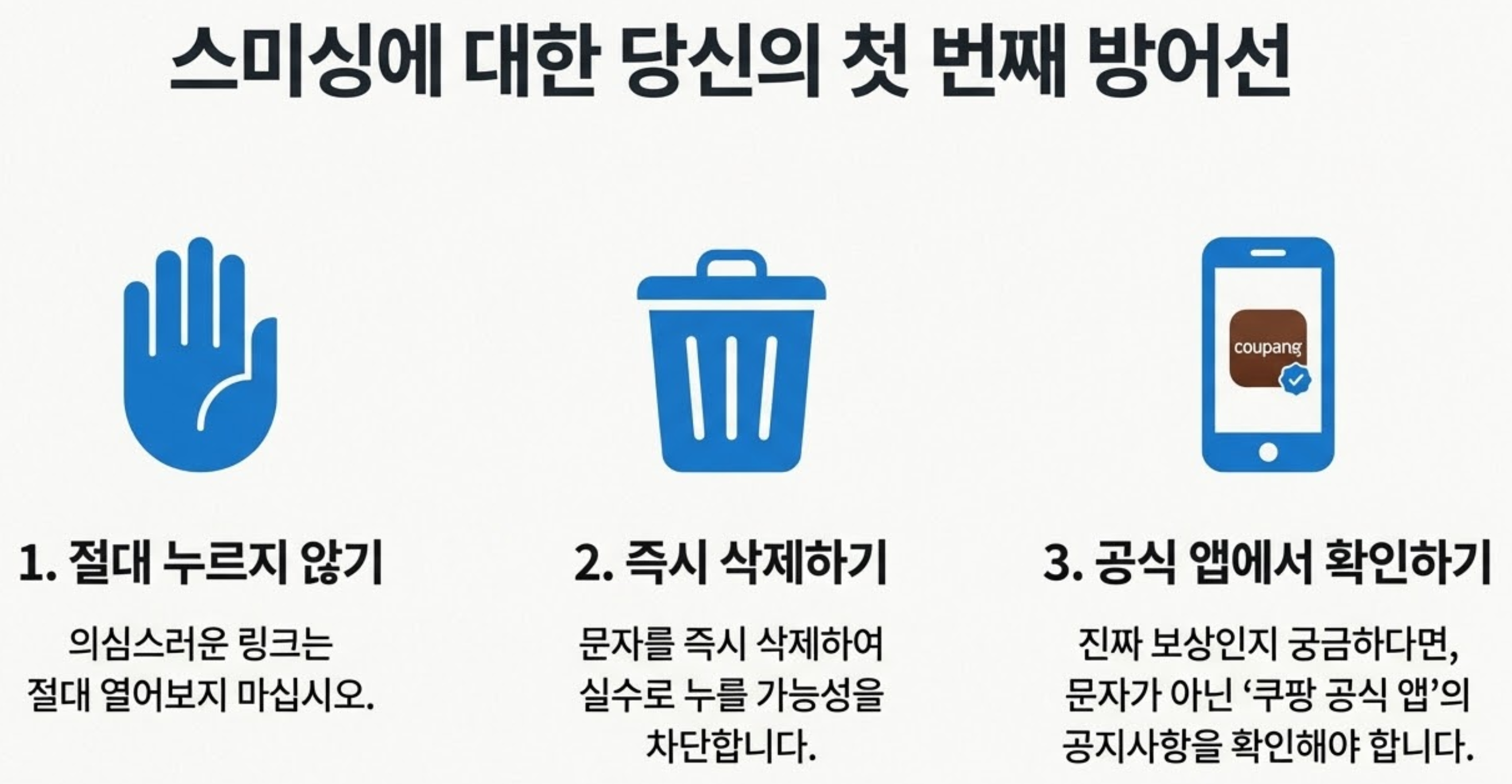 문자로 온 링크는 스미싱 위험이 높으니, 쿠팡 공식 앱에서만 보상 공지를 확인하세요. 공지가 없다면 100% 사기입니다.