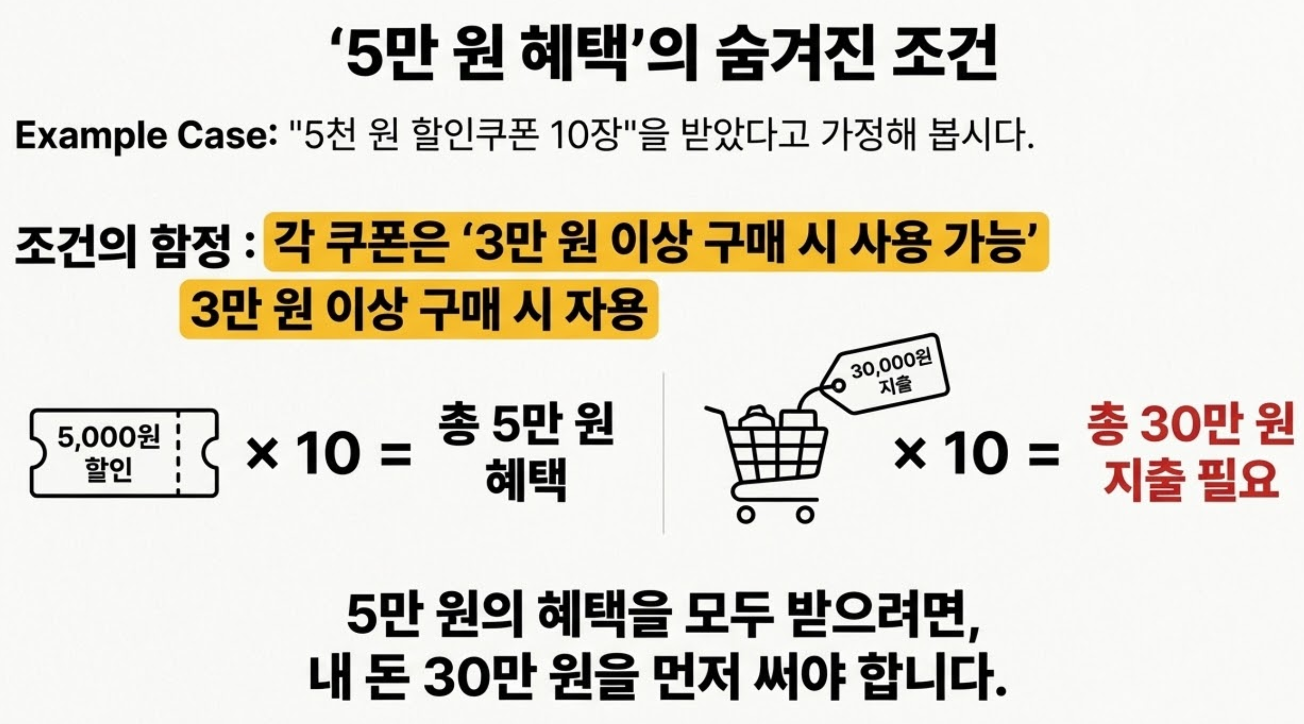 이 쿠폰들은 '3만 원 이상 구매 시 사용 가능'과 같은 조건을 달아, 결국 5만 원 혜택을 다 보려면 최소 30만 원 이상을 소비하게 만듭니다. 이는 '보상'이 아닌 "우리 물건 더 사줘"라는 '판촉(프로모션)'에 가깝습니다.