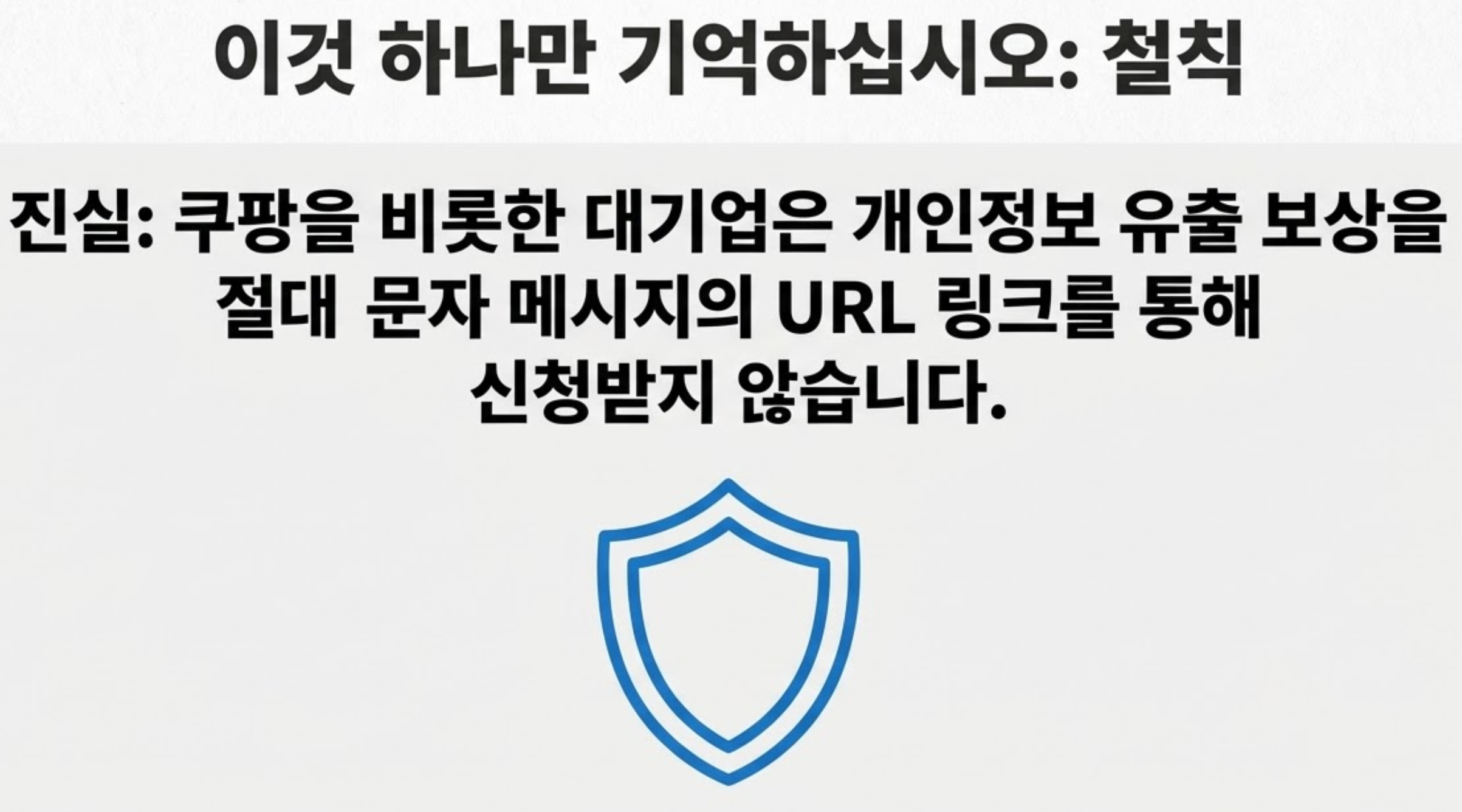 만약 문자로 "보상금 신청" 링크를 유도한다면, 이는 100% '스미싱' 사기입니다. 클릭하는 순간 악성 앱이 깔려 금융 정보가 유출될 수 있습니다. 링크는 절대 누르지 말고 즉시 삭제하세요. 보상 공식 여부는 반드시 '쿠팡 공식 앱' 공지사항에서 확인해야 합니다.
