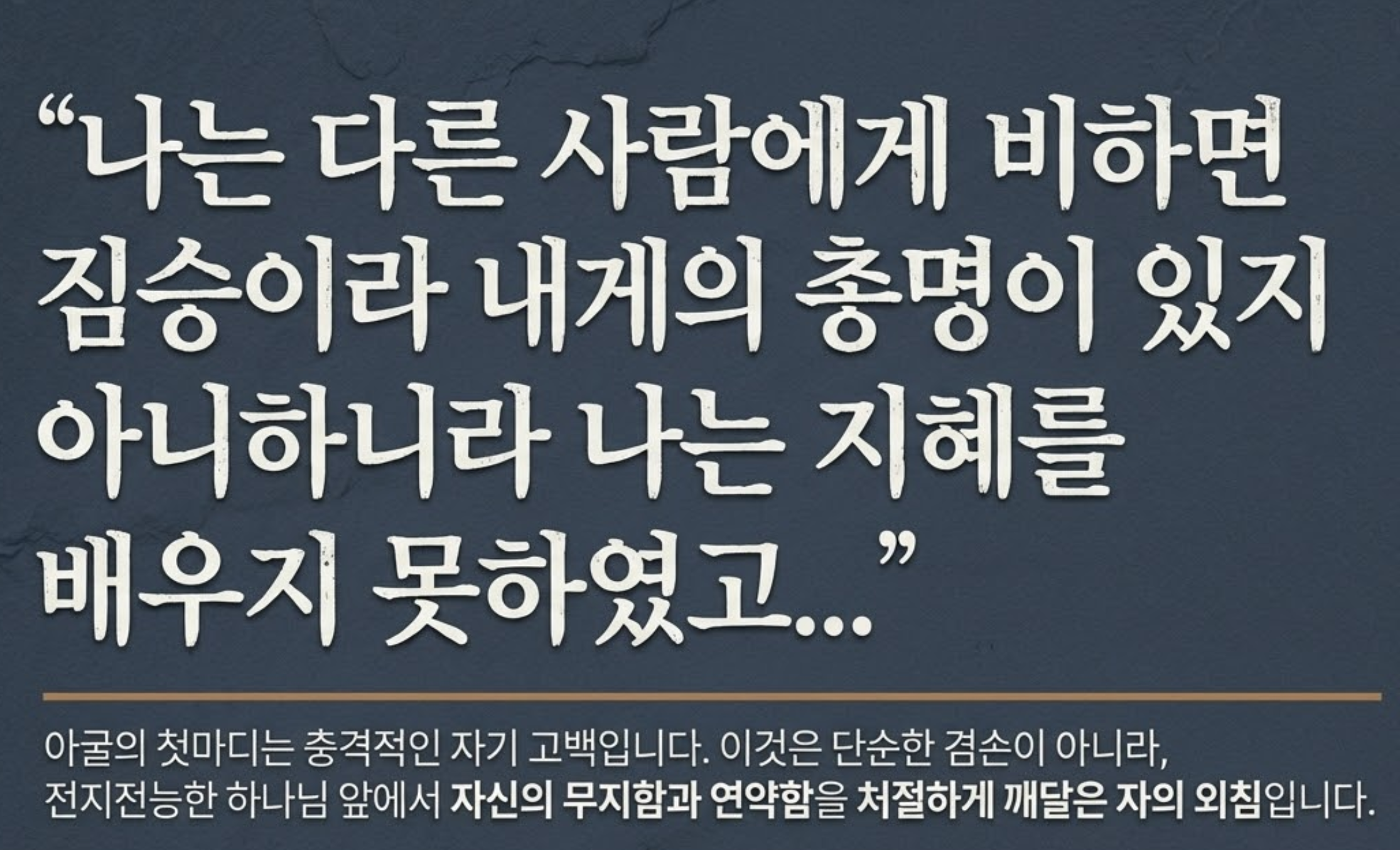 "나는 다른 사람에게 비하면 짐승이라 내게는 사람의 총명이 있지 아니하니라. 나는 지혜를 배우지 못하였고..." (잠 30:2-3)