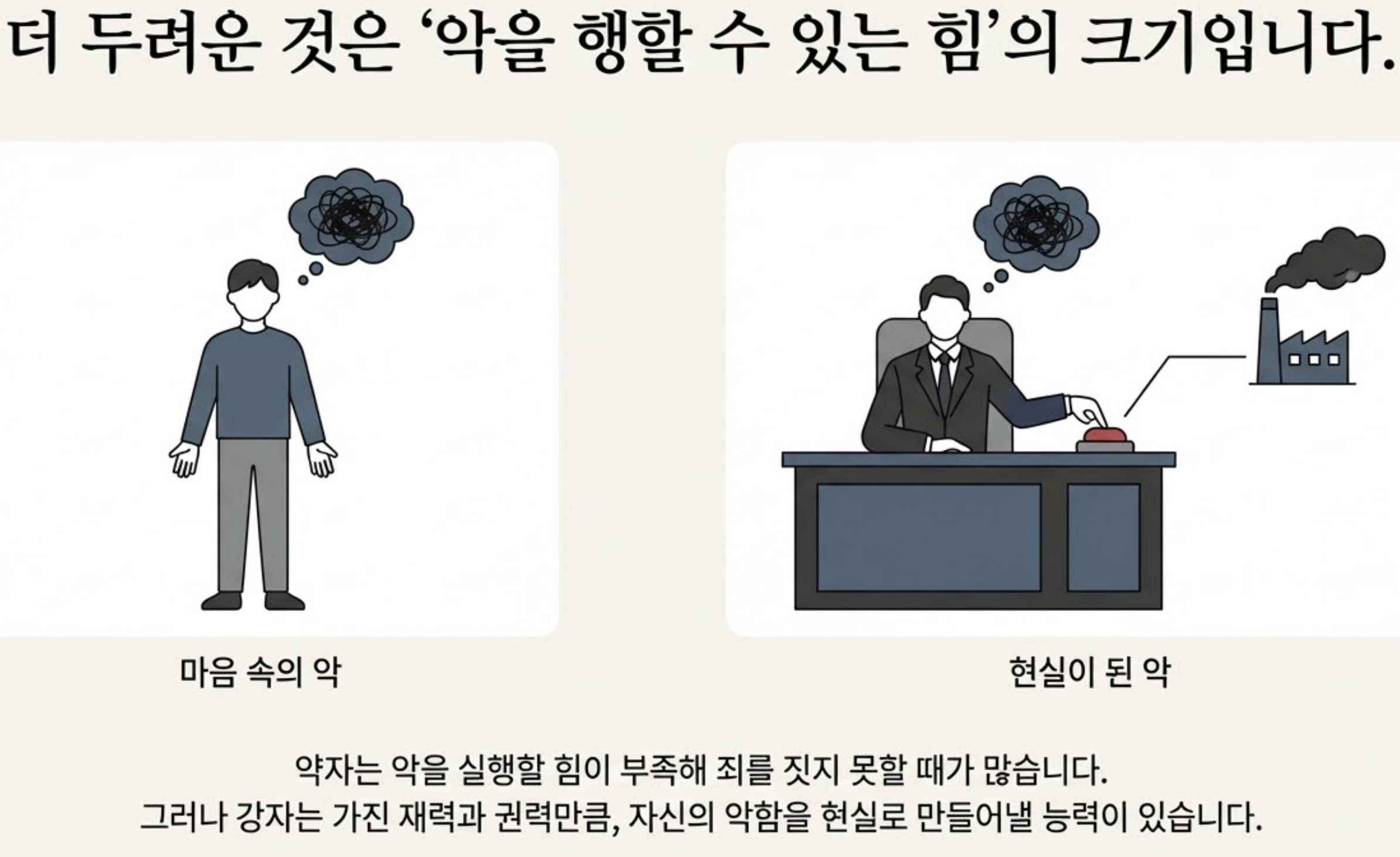 더 두려운 것은 '악을 행할 수 있는 힘'의 크기입니다. 약자는 마음속에 악이 있어도 그것을 실행할 힘이 부족해 죄를 짓지 못할 때가 많습니다. 그러나 강자는 가진 재력과 권력만큼, 자신의 악함을 현실로 만들어낼 능력이 있습니다. 그래서 많이 가진 자일수록, 높은 자리에 올라갈수록 그 영혼은 훨씬 더 위태롭고 시험에 들 일이 많아지는 것입니다.
