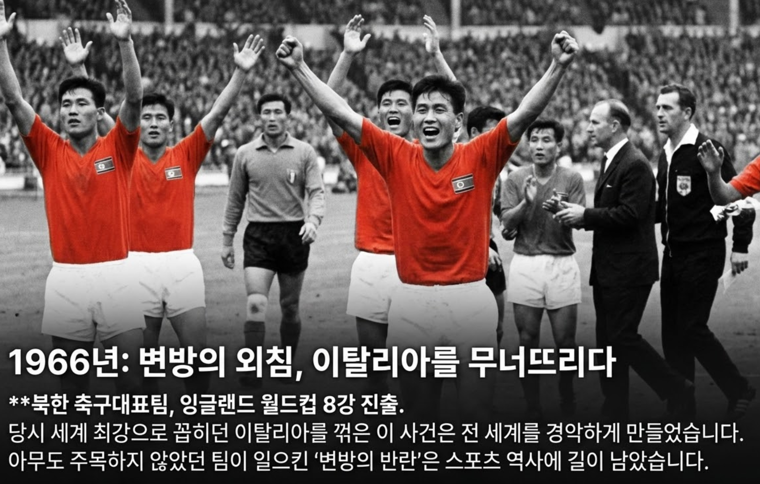 축구 팬들이라면 기억하실 겁니다. 1966년 잉글랜드 월드컵! 북한 축구대표팀이 강호 이탈리아를 꺾고 8강에 진출하며 전 세계를 경악하게 만들었던 해입니다. 아무도 예상치 못한 '변방의 반란'이었죠. 병오년 특유의 "계급장 떼고 붙어보자"는 강한 승부욕과 에너지가 스포츠 역사에도 고스란히 담겨 있습니다.