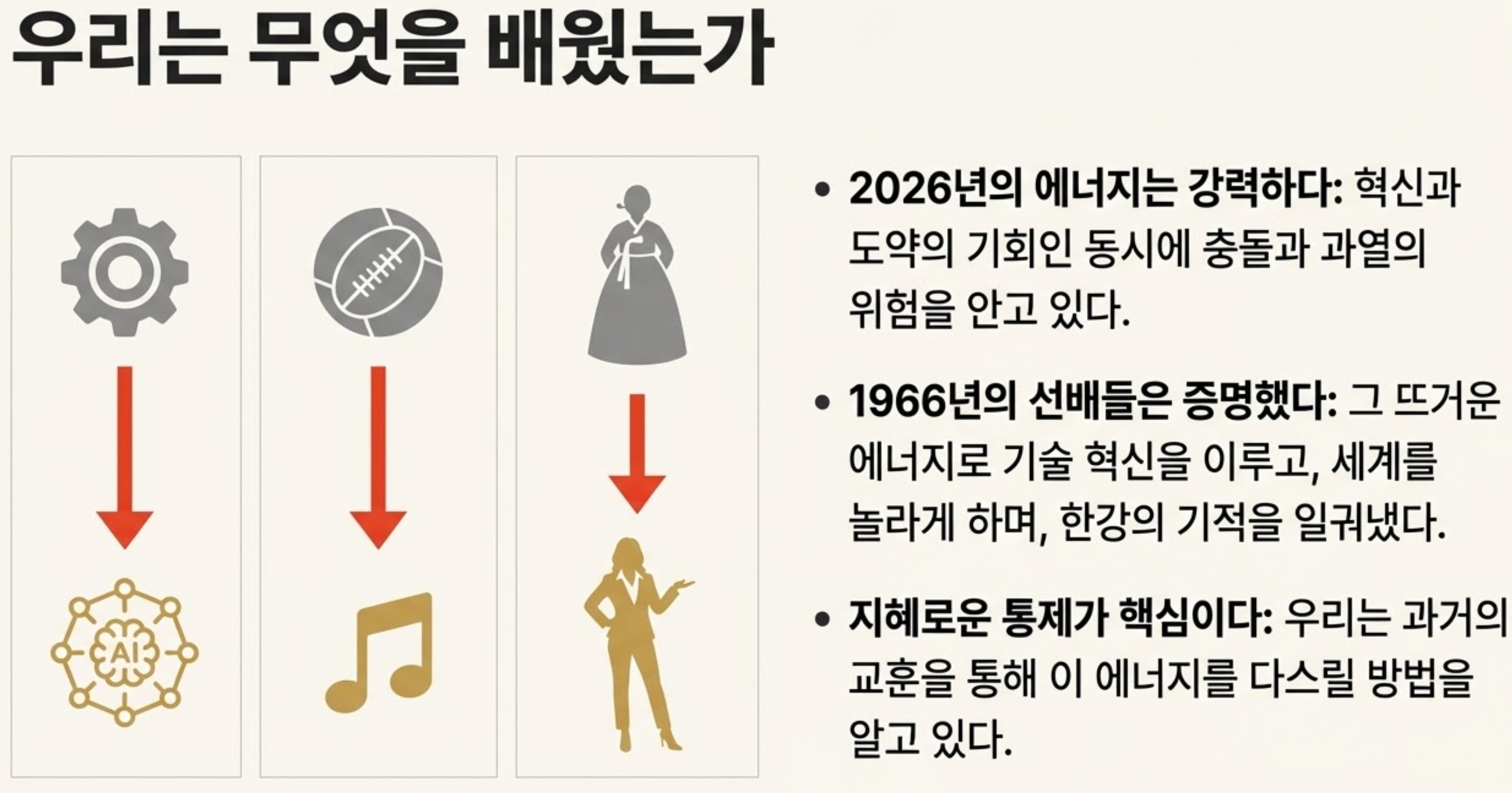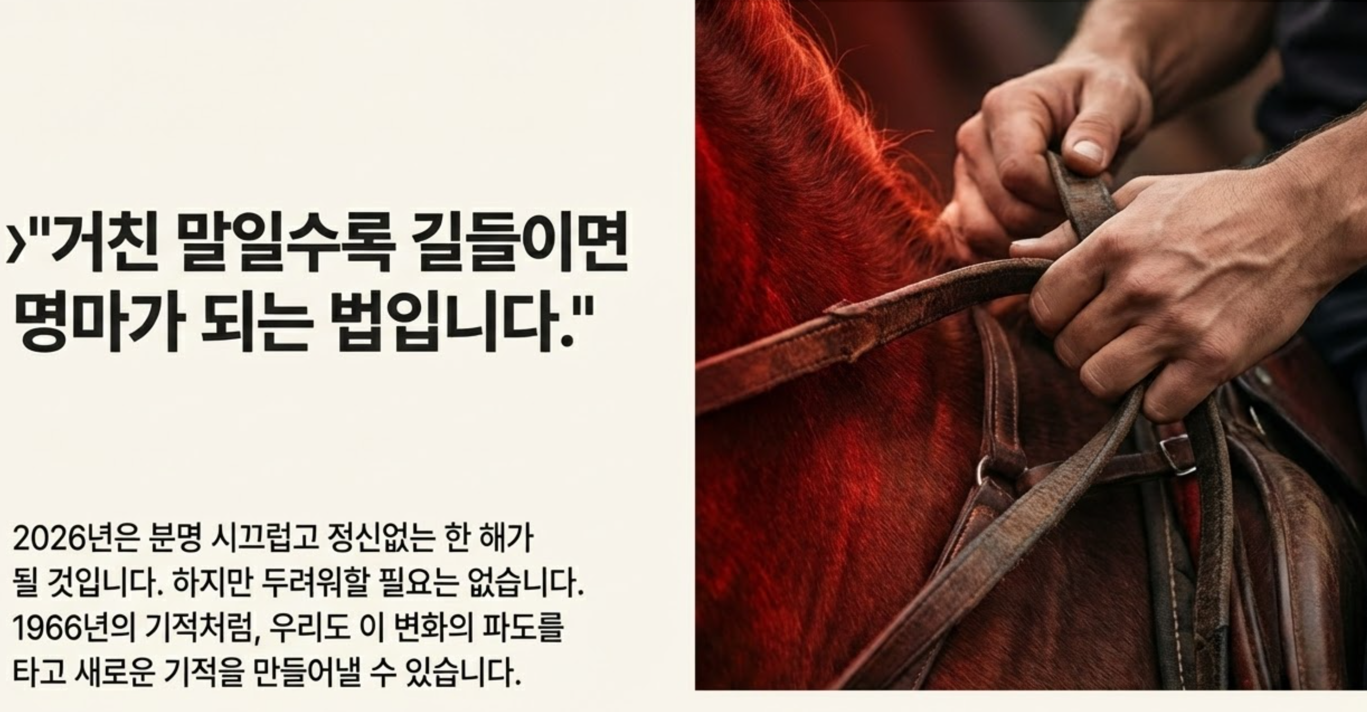 2026년 병오년, 분명 시끄럽고 정신없는 한 해가 될 것입니다. 하지만 두려워할 필요는 없습니다. 거친 말일수록 길들이면 명마가 되는 법입니다. 1966년 우리 선배들이 그 뜨거운 에너지로 한강의 기적을 일궈냈듯, 2026년의 우리도 이 변화의 파도를 타고 새로운 기적을 만들어낼 수 있습니다.