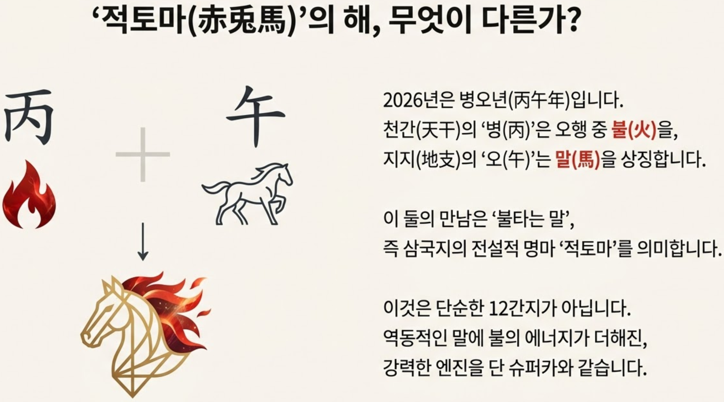 우리가 흔히 말하는 12 간지 동물들은 각각 색깔을 가지고 있습니다. 2026년의 천간인 '병(丙)'은 오행 중 불(Fire)을 상징하고, 지지인 '오(午)'는 말을 상징합니다. 즉, '불타는 말', 바로 삼국지 여포와 관우가 탔다는 전설의 명마 '적토마'의 해인 것입니다.