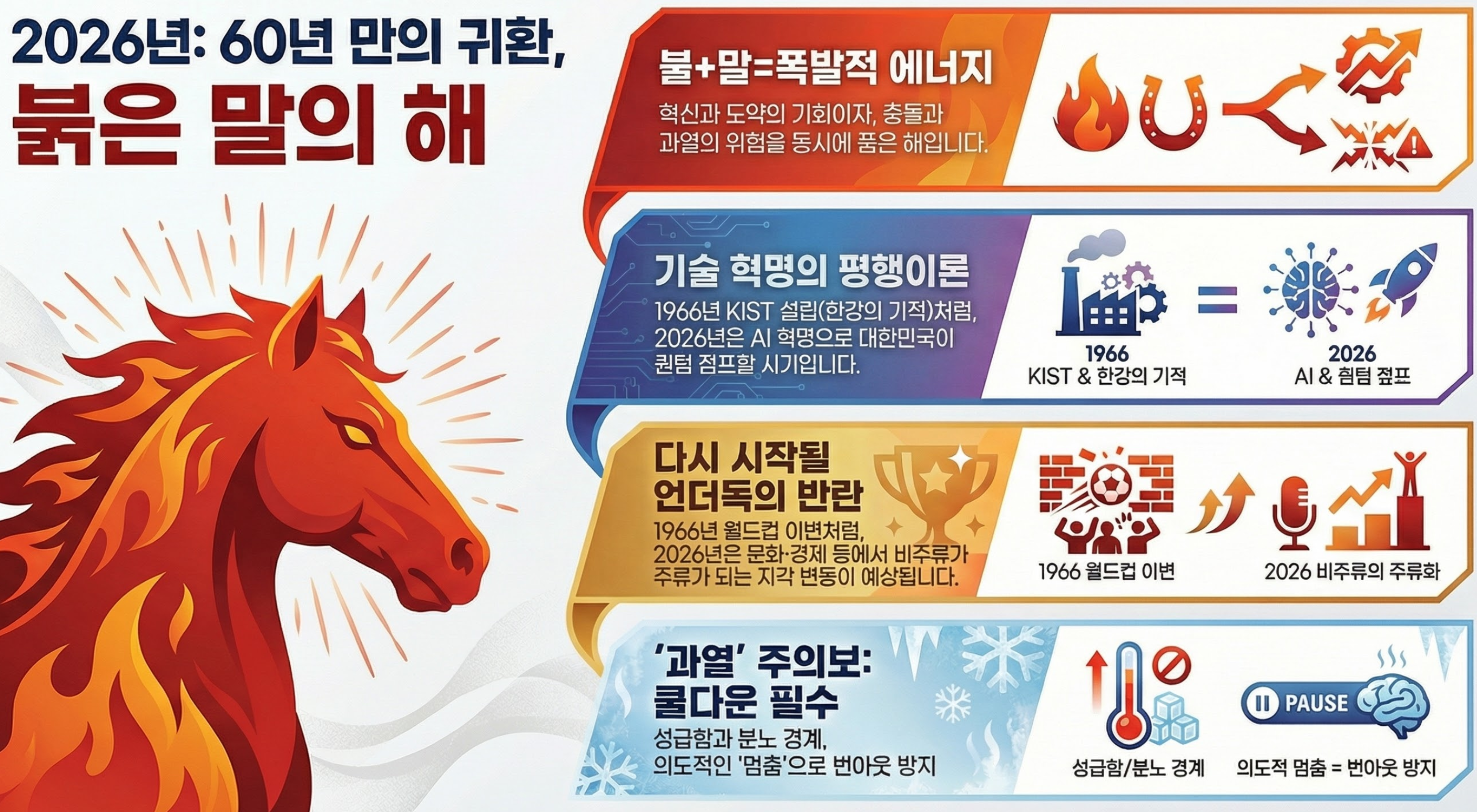 - ✔️ 2026년은 60년 만의 '붉은 말' 해: 폭발적인 변화와 혁신, 때로는 충돌의 에너지가 넘칩니다.