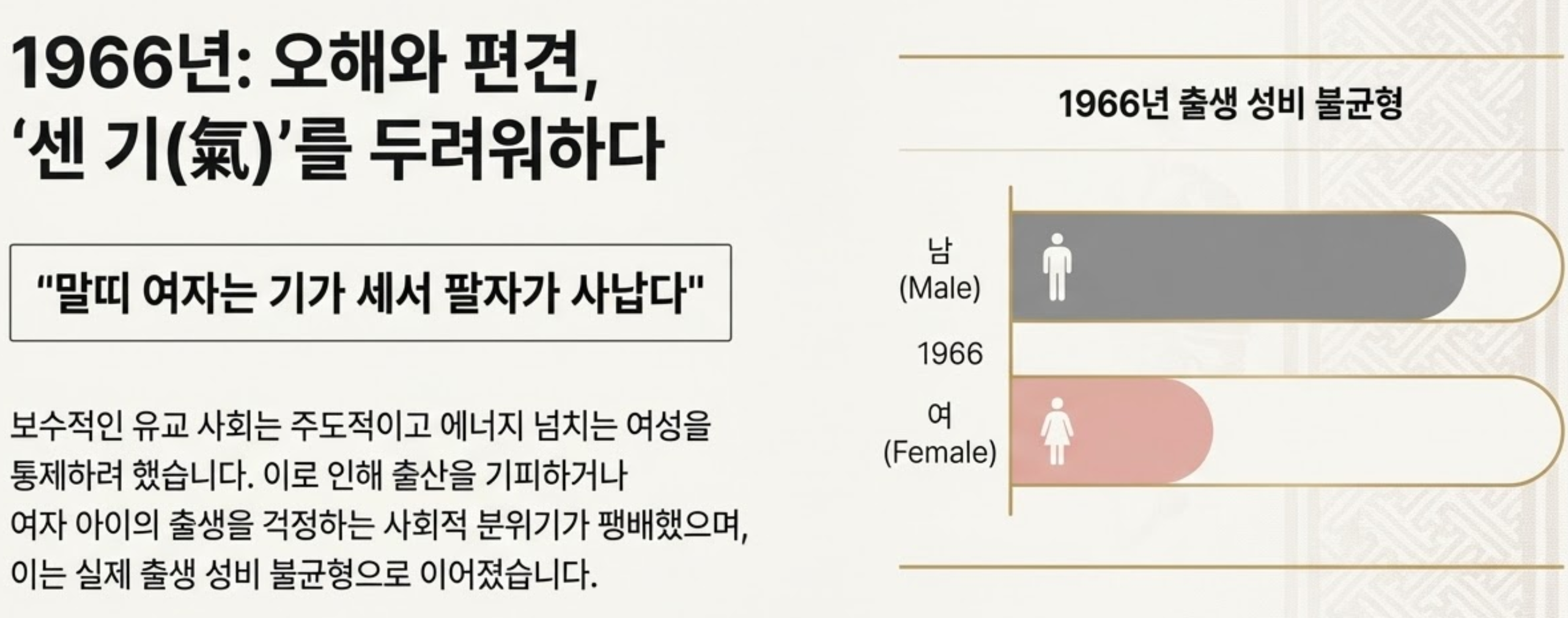 "말띠 여자는 기가 세서 팔자가 사납다?" 1966년 당시, 이런 속설 때문에 출산을 기피하거나 여자 아이가 태어나면 걱정부터 하는 어처구니없는 사회적 분위기가 있었습니다. 실제로 1966년은 출생 성비 불균형이 심했던 해로 기록되어 있습니다. 보수적인 유교 사회에서 여성이 주도적이고 에너지가 넘치는 것을 두려워했기 때문입니다.